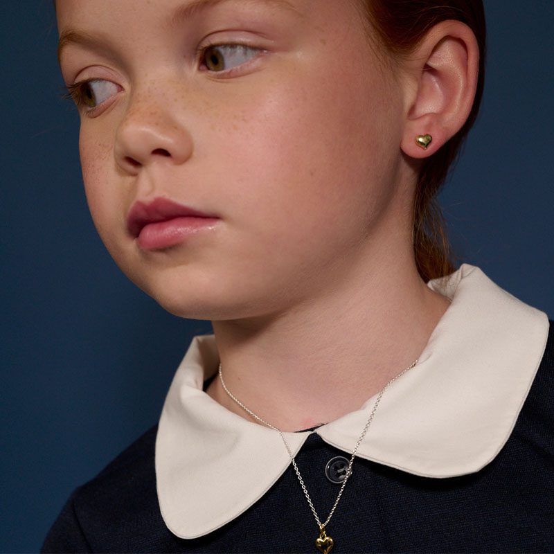 Our Aria yellow gold heart earrings make the perfect first set of earrings for your little one, or an ideal gift for older children. Made slightly bigger so suitable for all ages and made from sterling silver with gold plating. These little star heart earrings are the ideal way to show some love. Enjoy complimentary Little Star Jewellery packaging and Free UK delivery.