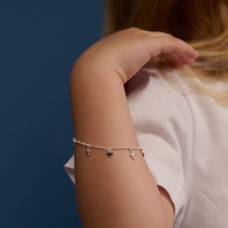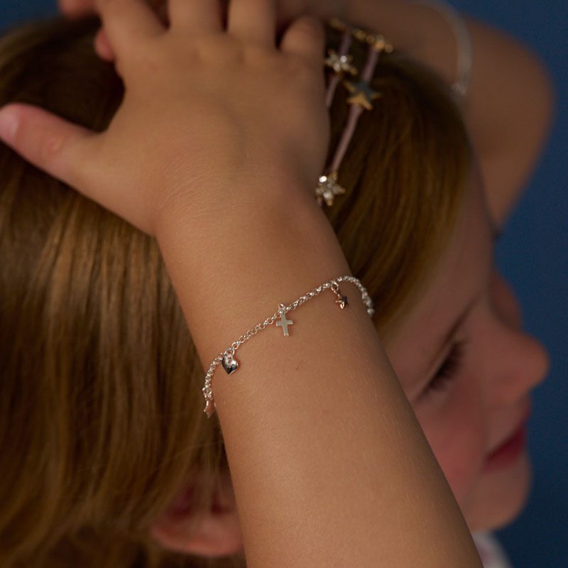 Another Little Star favourite, this bracelet is a perfect combination of hearts, stars and crosses. Adjustable to fit ages 4 to 16 years.