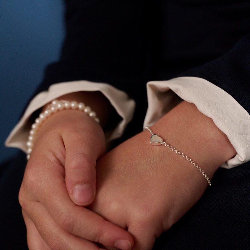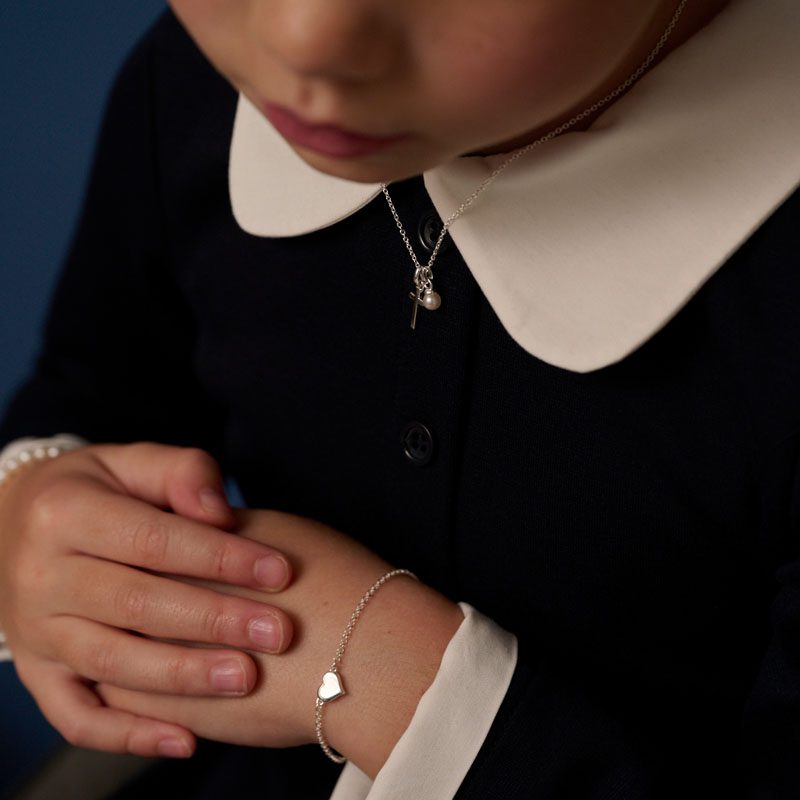 This exquisite sterling silver bracelet features a delicate design with a charming heart centrepiece, beautifully inlaid with shimmering mother of pearl. The soft, iridescent glow of the mother of pearl creates a timeless, elegant touch, making this bracelet the perfect gift for any special occasion. Ideal for girls, it’s especially perfect for flower girls and as a thoughtful First Communion gift. With its graceful, lightweight construction, this bracelet adds a subtle yet meaningful sparkle, making it a cherished keepsake for years to come. A truly beautiful way to celebrate a precious moment in a young girl’s life.