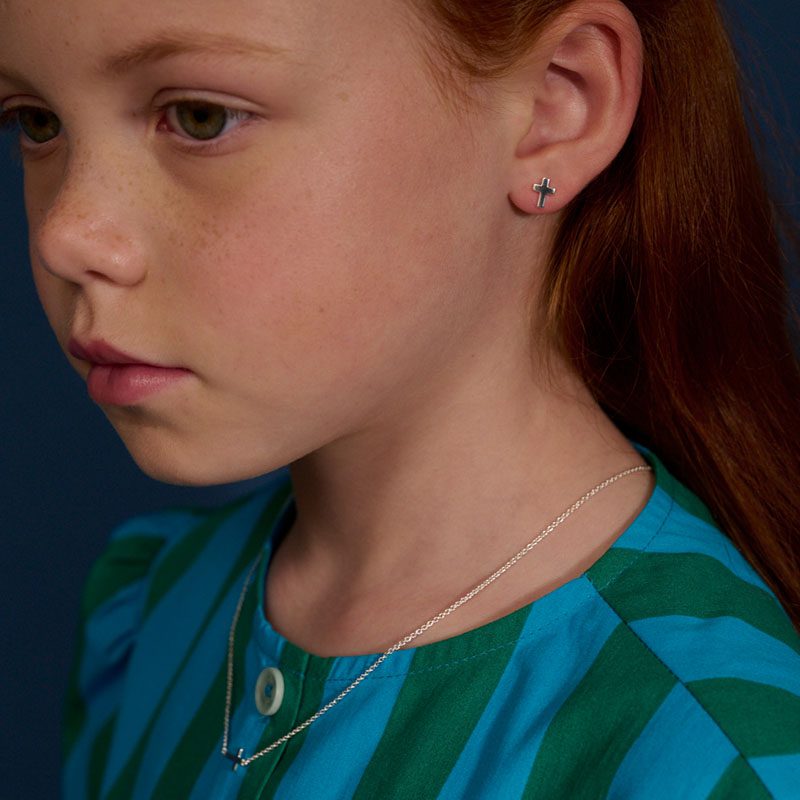 Eden our classic Cross stud earrings in sterling silver. These sterling silver cross earrings are a timeless classic making them a cherished piece for jewellery lovers of all ages. The butterfly backs ensure that the earrings remain securely in place, offering comfort for prolonged wear, a classic first pair of kids earrings.