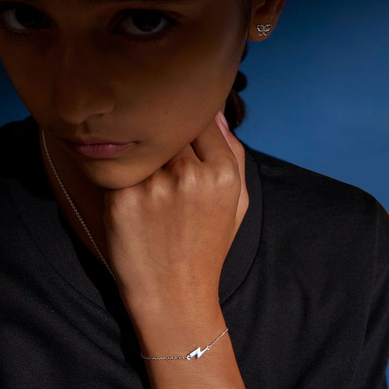 Our children’s bracelet featuring a lightning bolt can be layered alongside other necklaces like stars, hearts or moons, and could appeal to children who like having a lot of little elements that reflect their interests and personality.