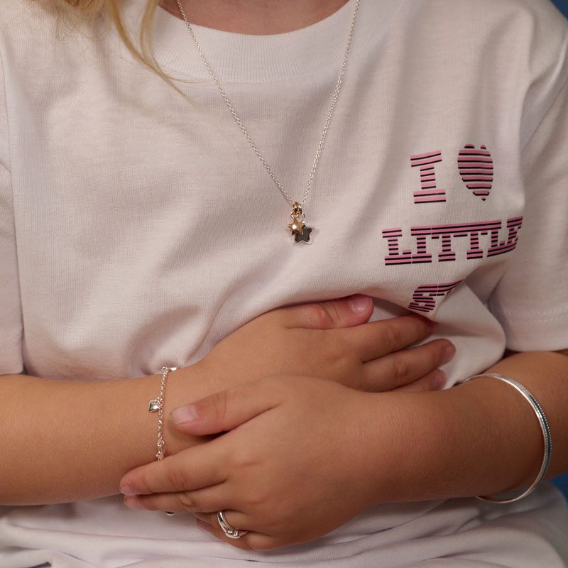 A double star necklace of 5 star quality. Solid silver with added Rose Gold detail this necklace can be worn by all ages and is a perfect gift for your Little Star. With Free Gift Box & Bag and Free UK Delivery.