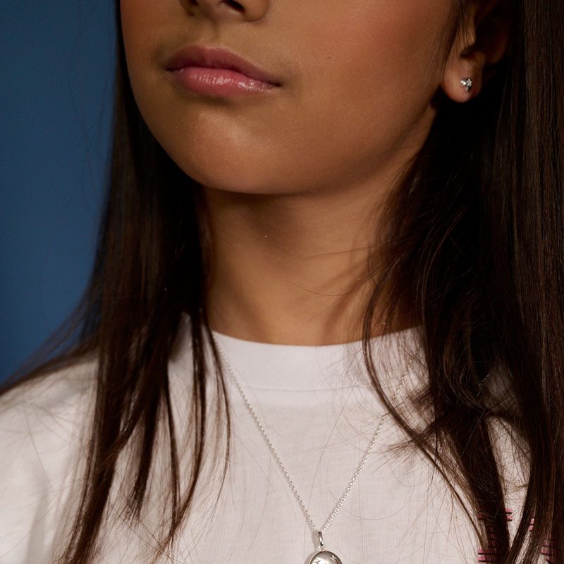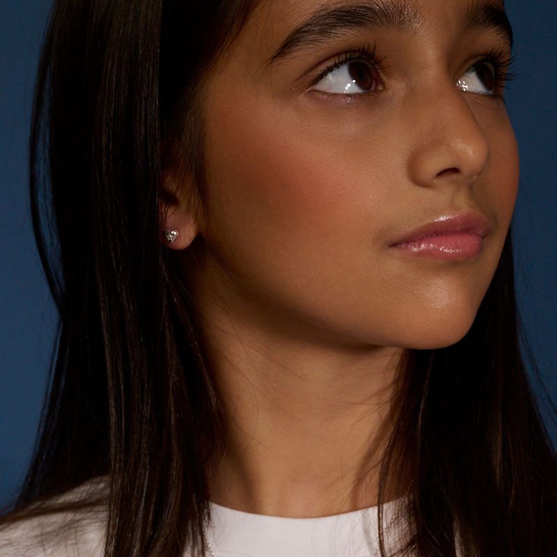 Little silver heart-shaped children’s earrings featuring Cosmo’s engraved star, set with a sparkling diamond.