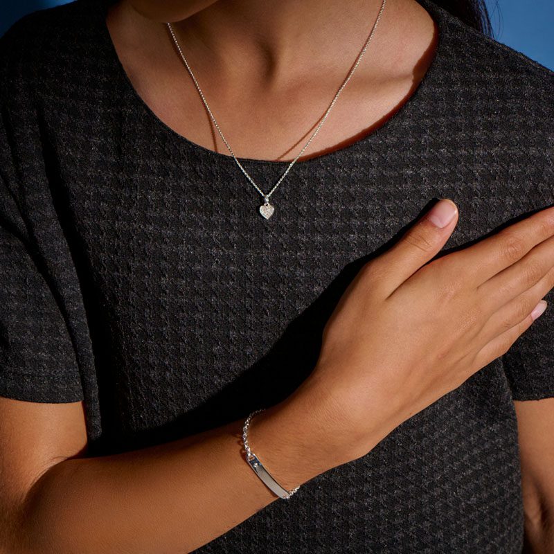 A timeless piece with a modern edge, the Vesper ID Bracelet is crafted in sterling silver and finished with luxurious platinum plating for a high-shine, refined look. At its heart sits a 0.07ct sparkling diamond, adding a delicate touch of elegance.