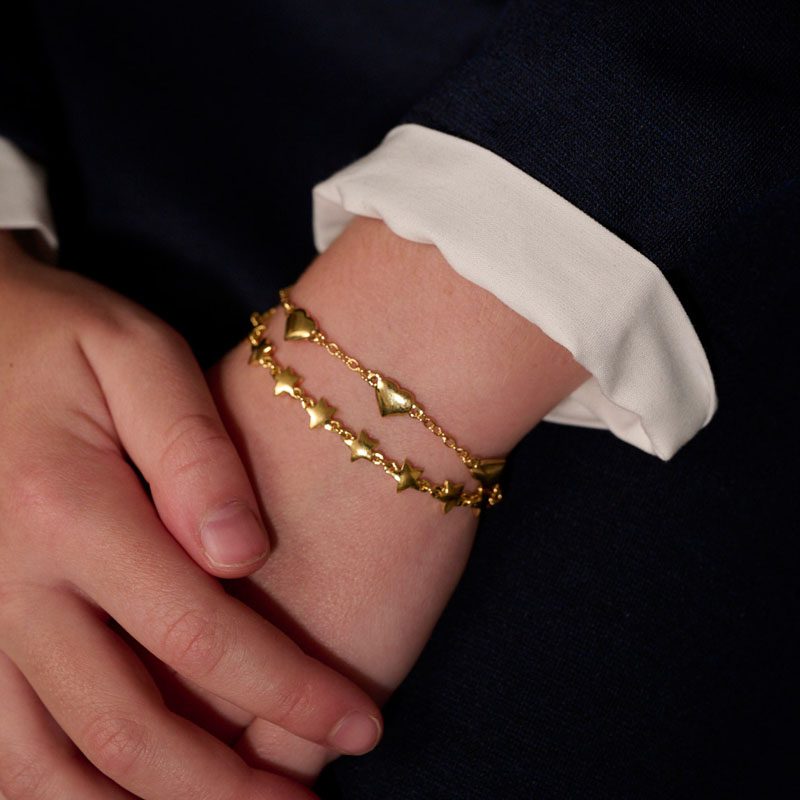 Delicate, charming, and timeless — our 5 Heart Station Style Gold Plated Bracelet is the perfect way to say “you’re loved.” Featuring five dainty heart charms evenly spaced along a sleek gold-plated chain, this bracelet adds a touch of sparkle and sentiment to any outfit.